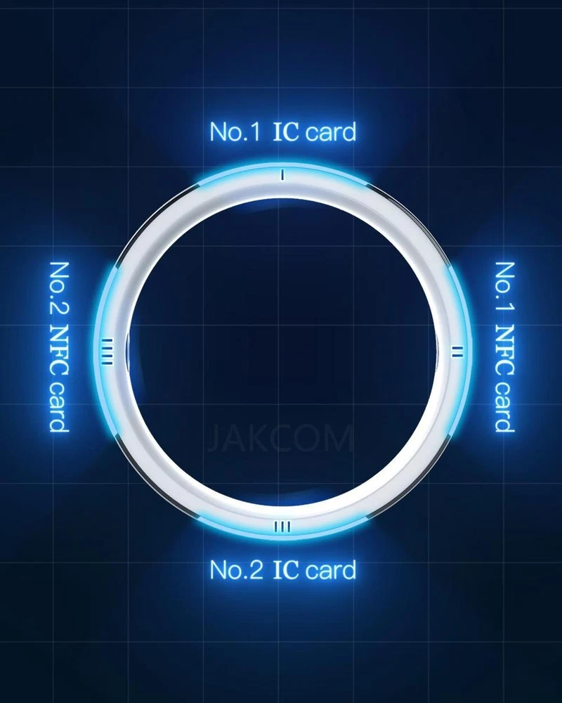 JAKCOM R5 Smart Ring Six RFID Cards | Social Sharing | Support Apple Shortcuts Wireless Flash Disk | Virtual Call and SOS | Support MI Smart Home Tai Chi Color Theme JAKCOM R5 has the unique Tai Chi design of double colors on front and back sides, which is a new fashionable accessory. Double Sides Double Styles Made of Fine Ceramics, No Fear of Scratches The whole body is made of microcrystal zirconium fine ceramics, The surface hardness is second only to diamond, durable and scratch free. Silky and Skin Friendly Owning to the low thermal conductivity of microcrystal zirconium, As well as over ten thousand times of CNC polishing, R5 has jade-like warmth and smoothness. No sweat produced in summer No cool sense in winner Six RFID Cards Coexist Built-in 6 sets of RFID chip modules, Simultaneously simulate 2 IC cards, 2 ID cards and 2 NFC cards, 6 cards coexist without conflict. IC card = 13.56MHZ Mifare1(M1) type proximity card ID card = 125KHZ EM type proximity card NFC card = 13.56MHZ NTAG type proximity card No.1 IC card No.2 IC card No.1 NFC card No.2 NFC card The white side is No.1 ID card The black side is No.2 ID card Before | Present Access control card Turnstile card Elevator card Before | Present Parking card Time card Shopping card Social Sharing Use the ring touch to share social contact, Almost include all mainstream social platforms. Great New Tool for Dating Add friends with one touch, simple and easy to use, quickly ice breaking. Wireless USB Flash Disk Use ring touch to transfer any files, and each ring has exclusive 128GB storage space. Great New Tool for Efficiency Transfer huge files within seconds without waiting One Touch to Start Up Smart Home Devices The ring can be set as a trigger for the intelligent scene of MI Home Smart Devices. One Touch to Launch Apple Shortcuts The ring can be set as the starting switch for Apple Shortcuts. Huawei Share The ring can be set as the connection tag of Huawei Share. Amibo The ring can be set as the common Amiibo to unlock the Nintendo game mode or props. Location Message The ring can trigger the phone to send GPS location messages to your multiple contact. Virtual Call The ring can trigger the cloud server to make a call to you, so that you can find an appropriate excuse for departure. Continuous Iteration More new functions are under continuous updates, Sincerely look forward to your exploration. Lightweight and Waterproof JAKCOM R5 has only 9 grams weight and dustproof & waterproof level of IP56. Dual Energy Stone, Dual Health The ring is inlaid with two energy stones to improve human EMFs. What is the EMFs ? Human action commands are issued by the brain. When the brain bio-electrical signals are transmitted to our limbs, An electromagnetic field around the whole body will be formed, which is called EMFs, Disease, stress and fatigue will interfere with the transmission of these electrical signals, Therefore, improving EMFs is one way to improve balance, strength and speed. Small Size, Large Power Compare favorably with the regulating ability of the energy wrist band, Especially developed for modern life, accompany you to improve your health statu The Best Gift of The Year JAKCOM smart ring has undergone updates for five generations, Unique and practical functions, superior technological quality, Always an excellent gift for relatives, friends and business intercourse. Size Specification 1.Make a circle around your finger with a thin, inelastic thread; 2.Tighten the thread slightly, otherwise, the ring size will be oversized; 3.Straighten the line, measure the length, and select the size according to the following table; Size: S, M, L Perimeter (mm): 50~58~63~73 Note: less than 58mm, 58mm ~ 63mm, longer than 63mm Packaging and Parameters Carrier Frequency: 13.56MHZ, 125KHZ RF Distance: 1~3cm IC Chip: CUID x2 ID Chip: T5577 x2 NFC Chip: Ntag216 x2 Ring Material: Ceramics Ring Weight: 9 Grams Protection Grade: IP56 Operating Temperature Range: -50℃—+80℃